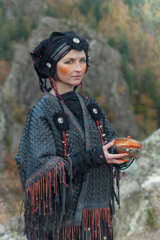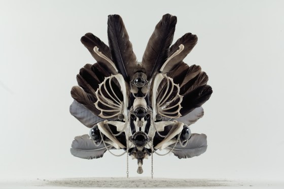 LE VENT NOIR (2014) Artwear : toile de coton, plumes, mousse, fil de fer, biais, clous tapissier, œillets métalliques, lacets,…