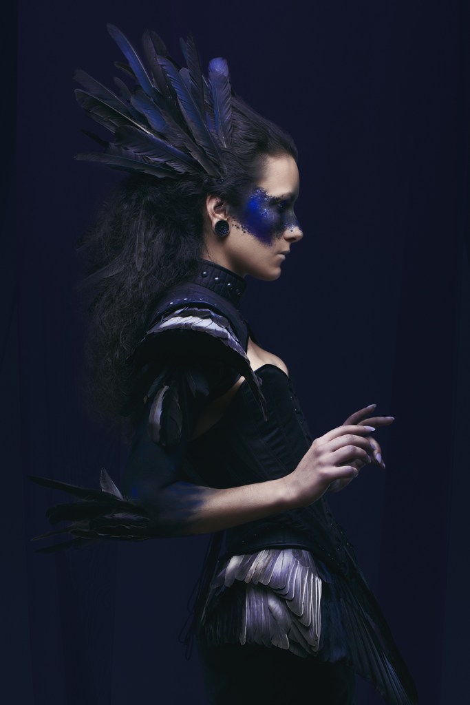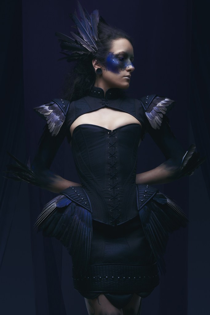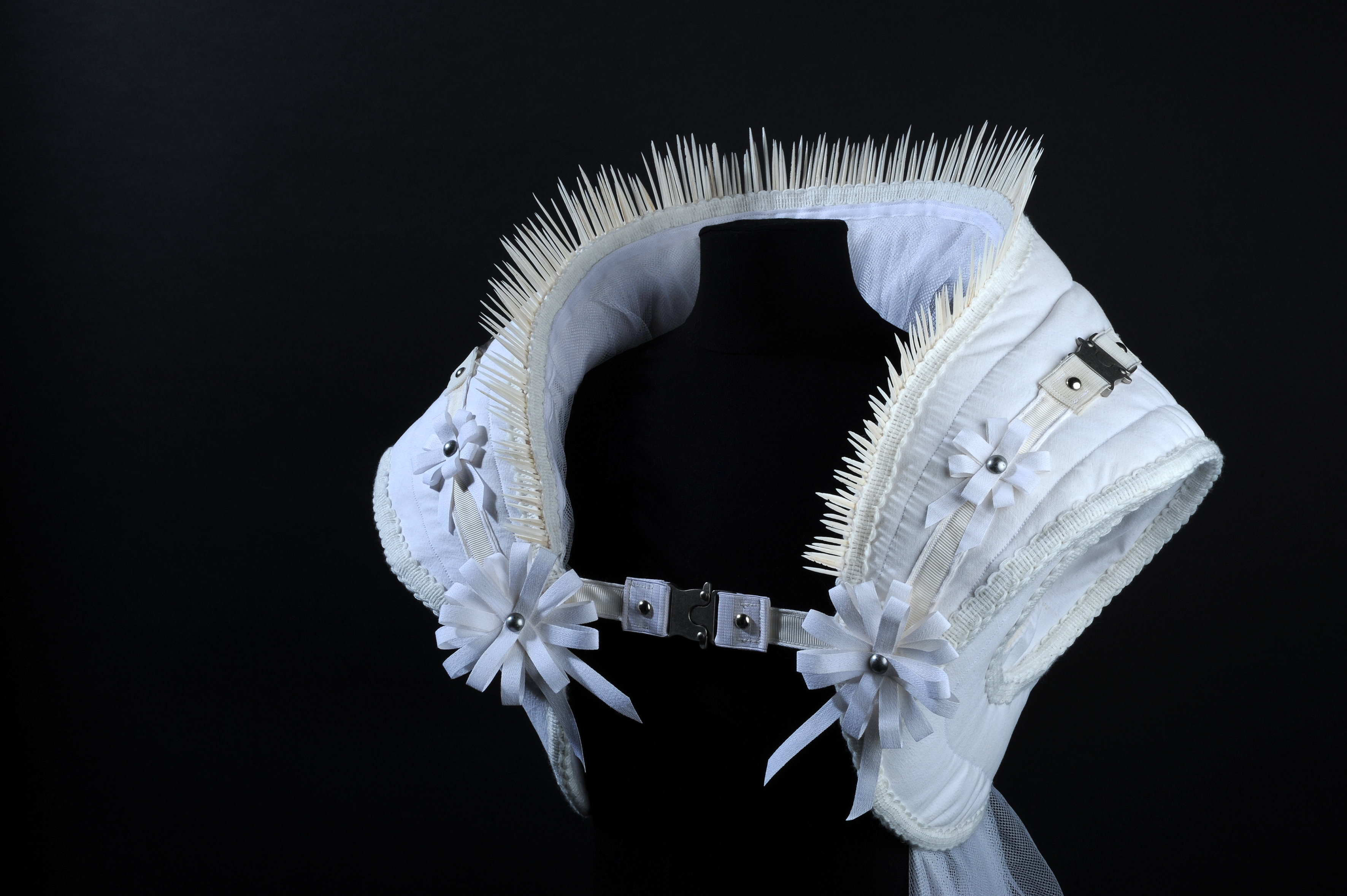 Artwear : toile de coton, plumes, mousse, fil de fer, biais, clous tapissier, œillets métalliques, lacets, colle. Couture à la machine et à la main.