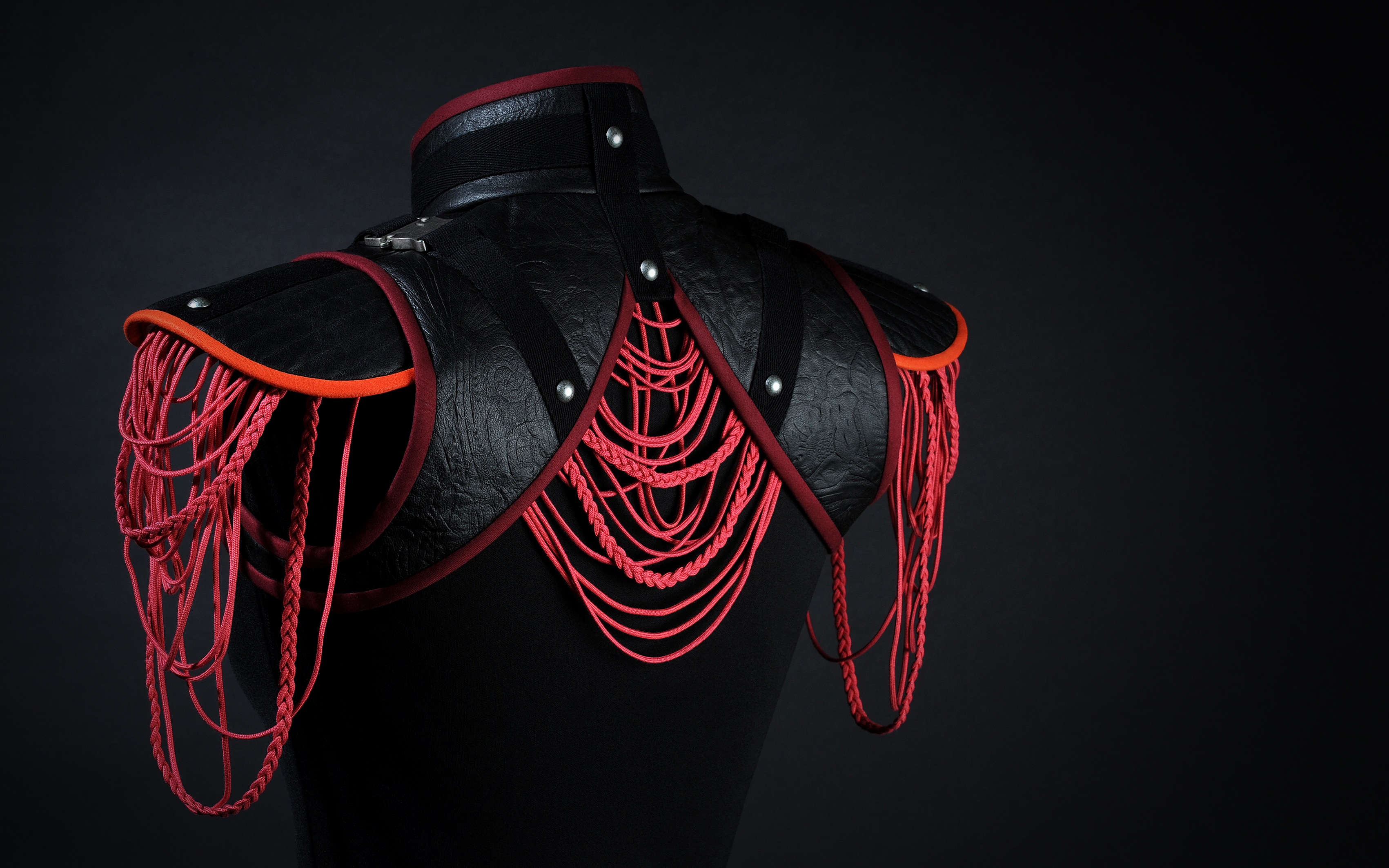 Artwear : cuir embossé, sangles, lacets, mousse, biais, boucles métalliques, clous tapissier. Couture à la machine.