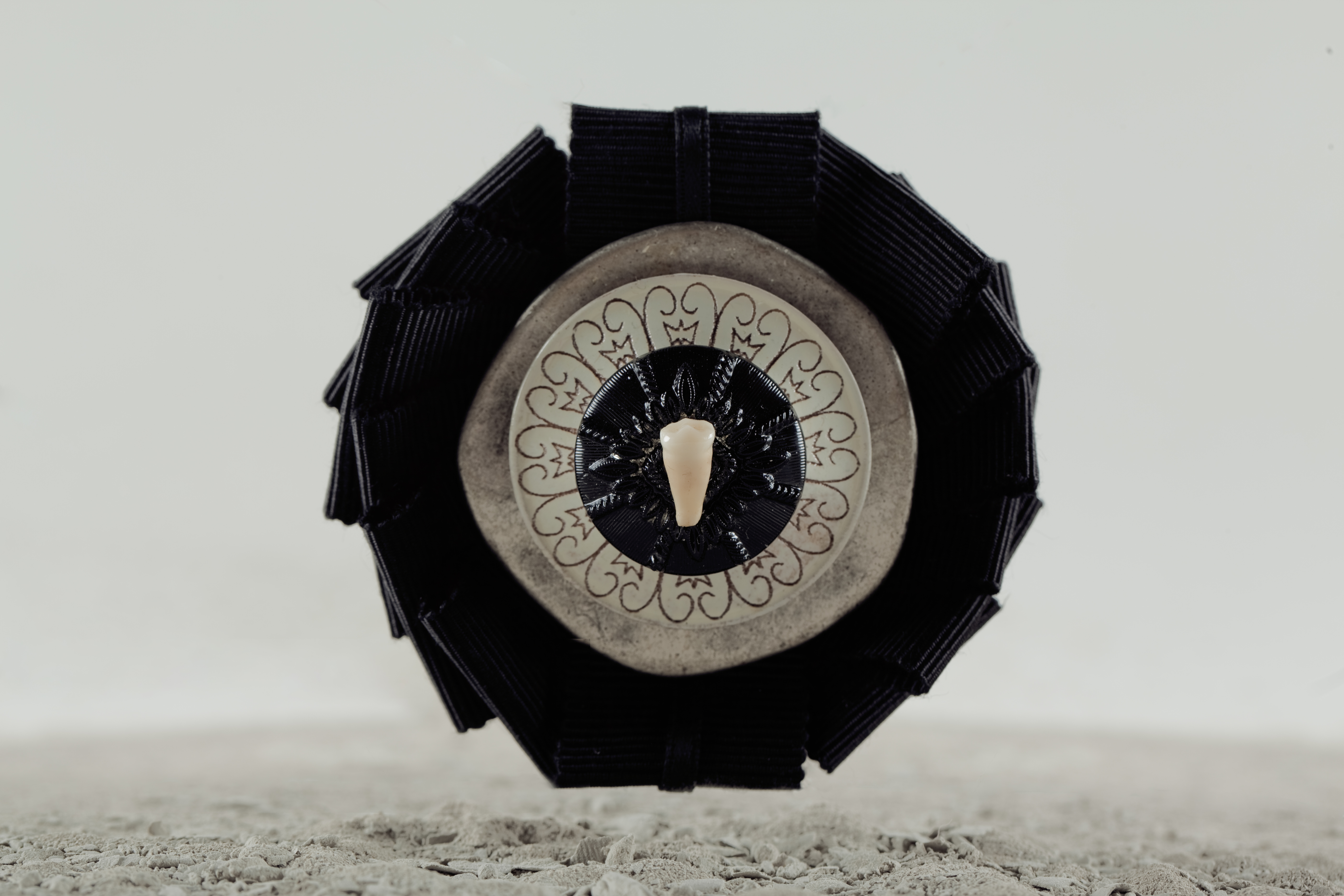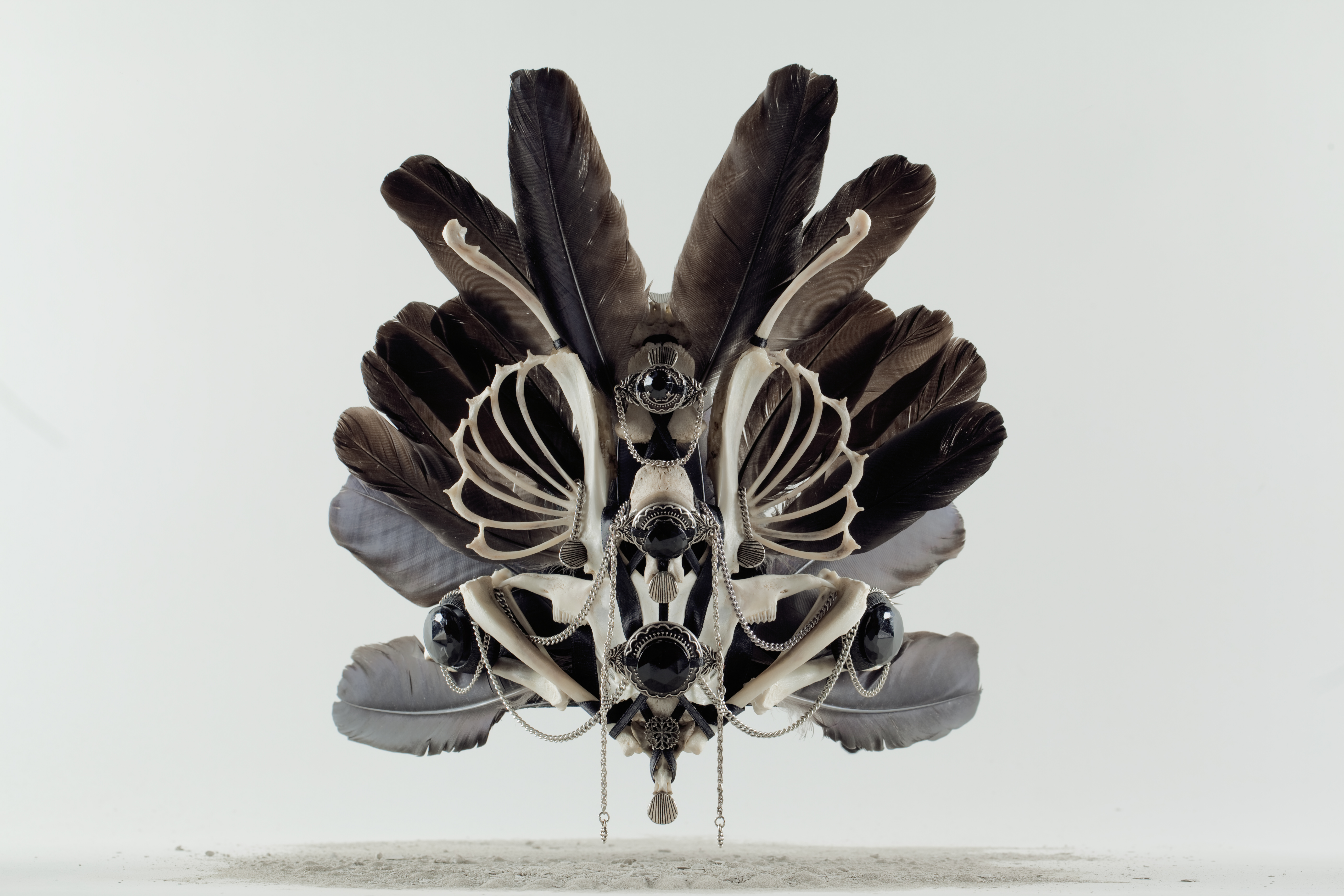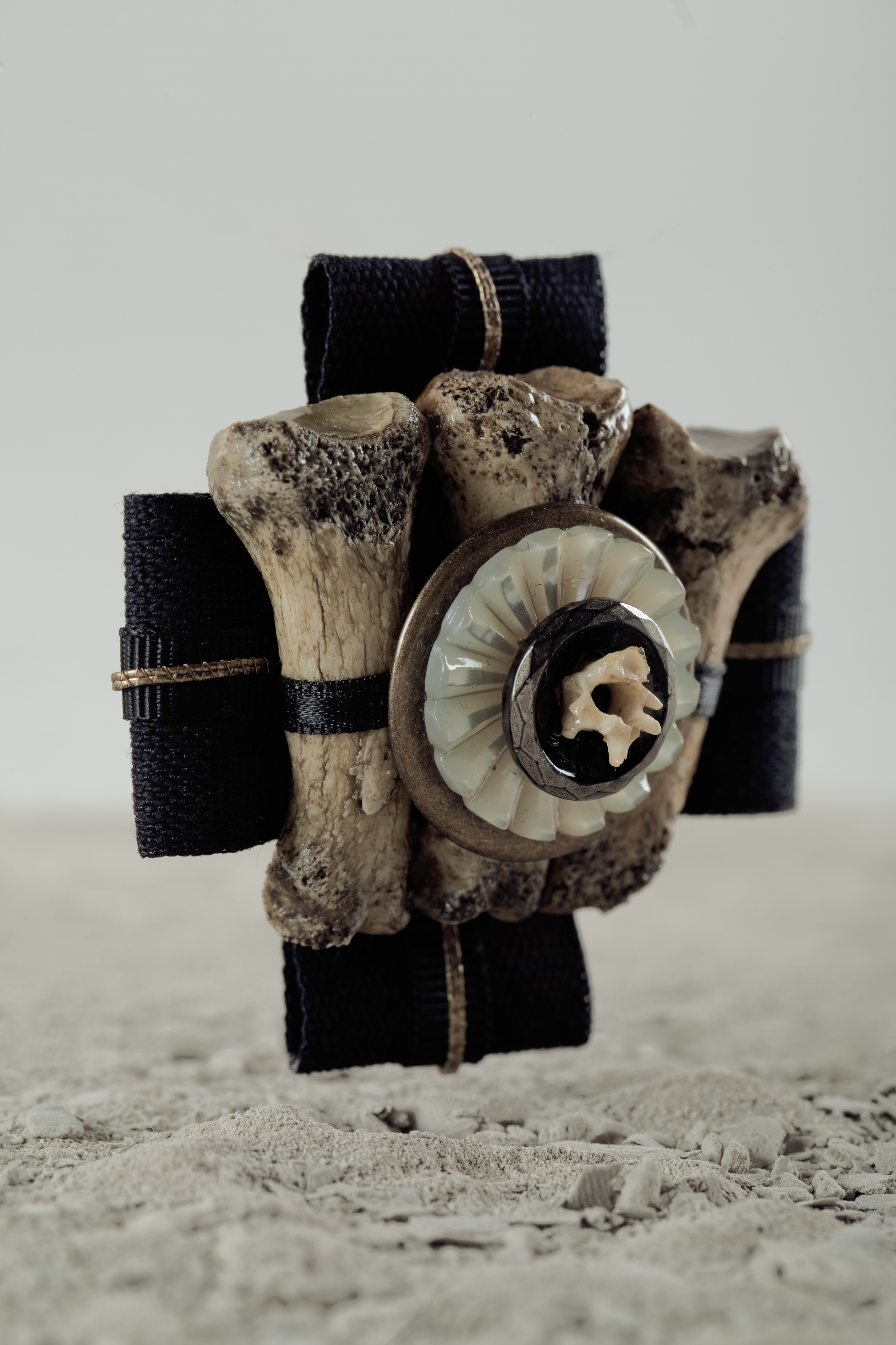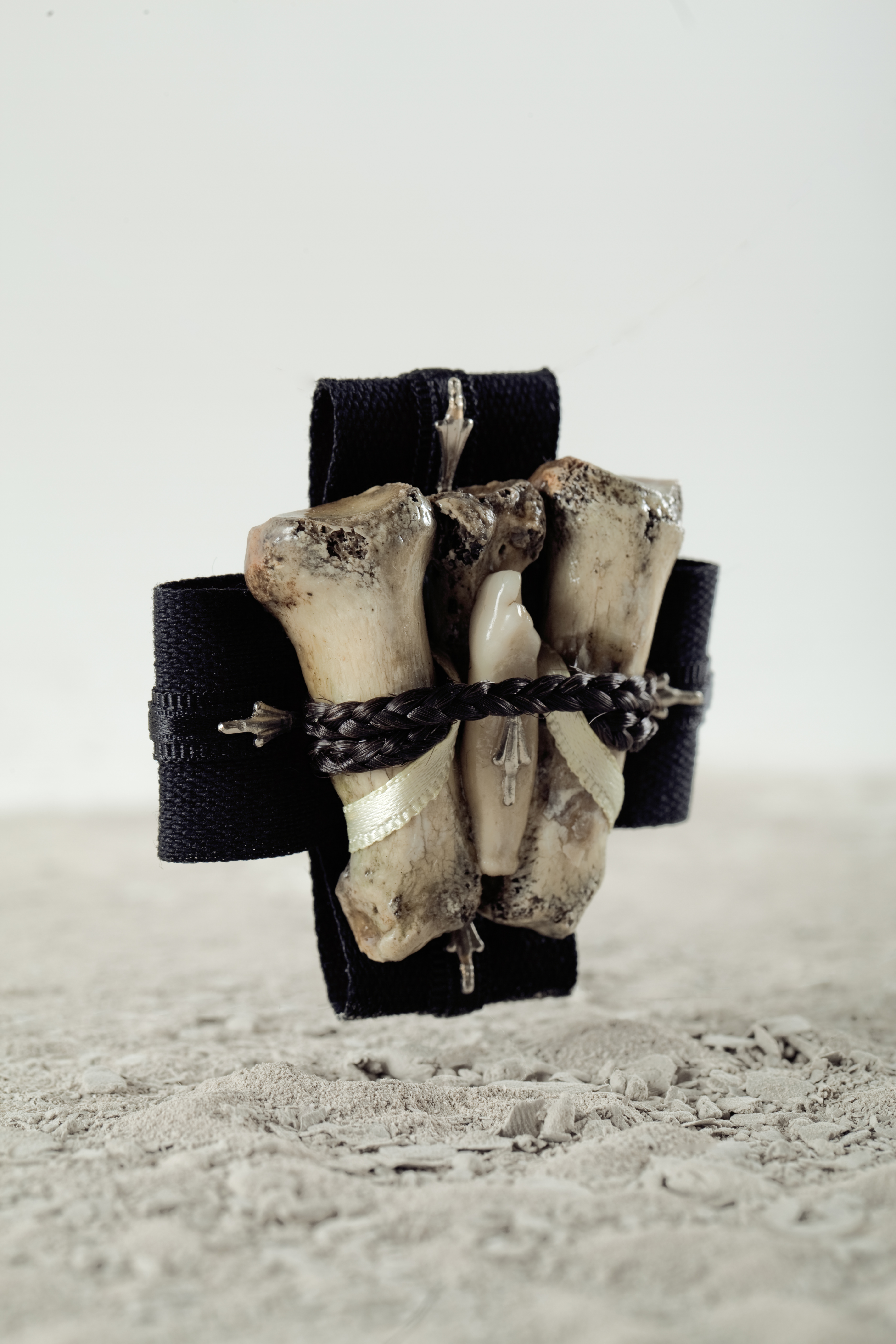 Accessoires : os, dents, boutons anciens, plumes, rubans et tresses, chaines et breloques, cheveux tressés, cuir, colle.