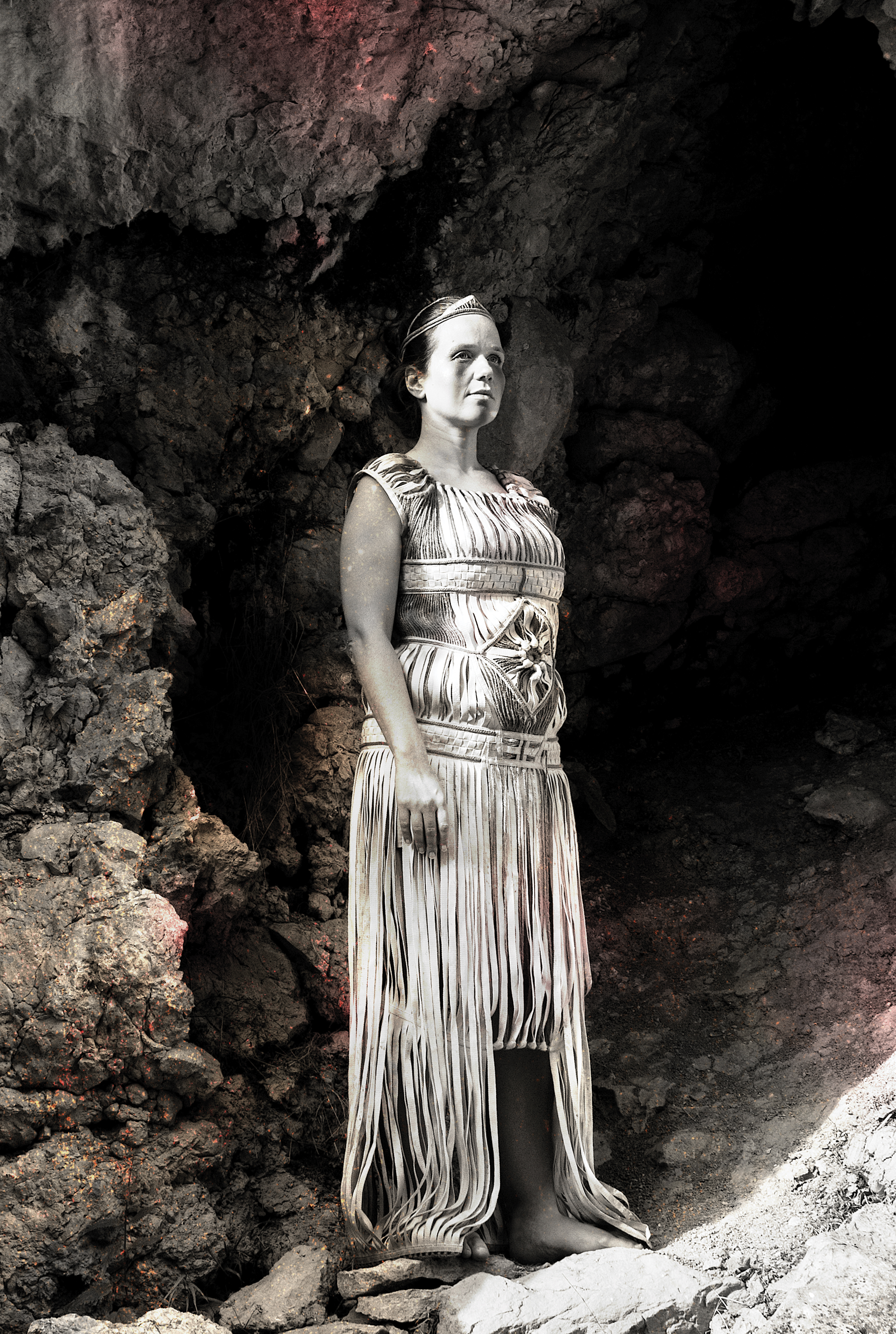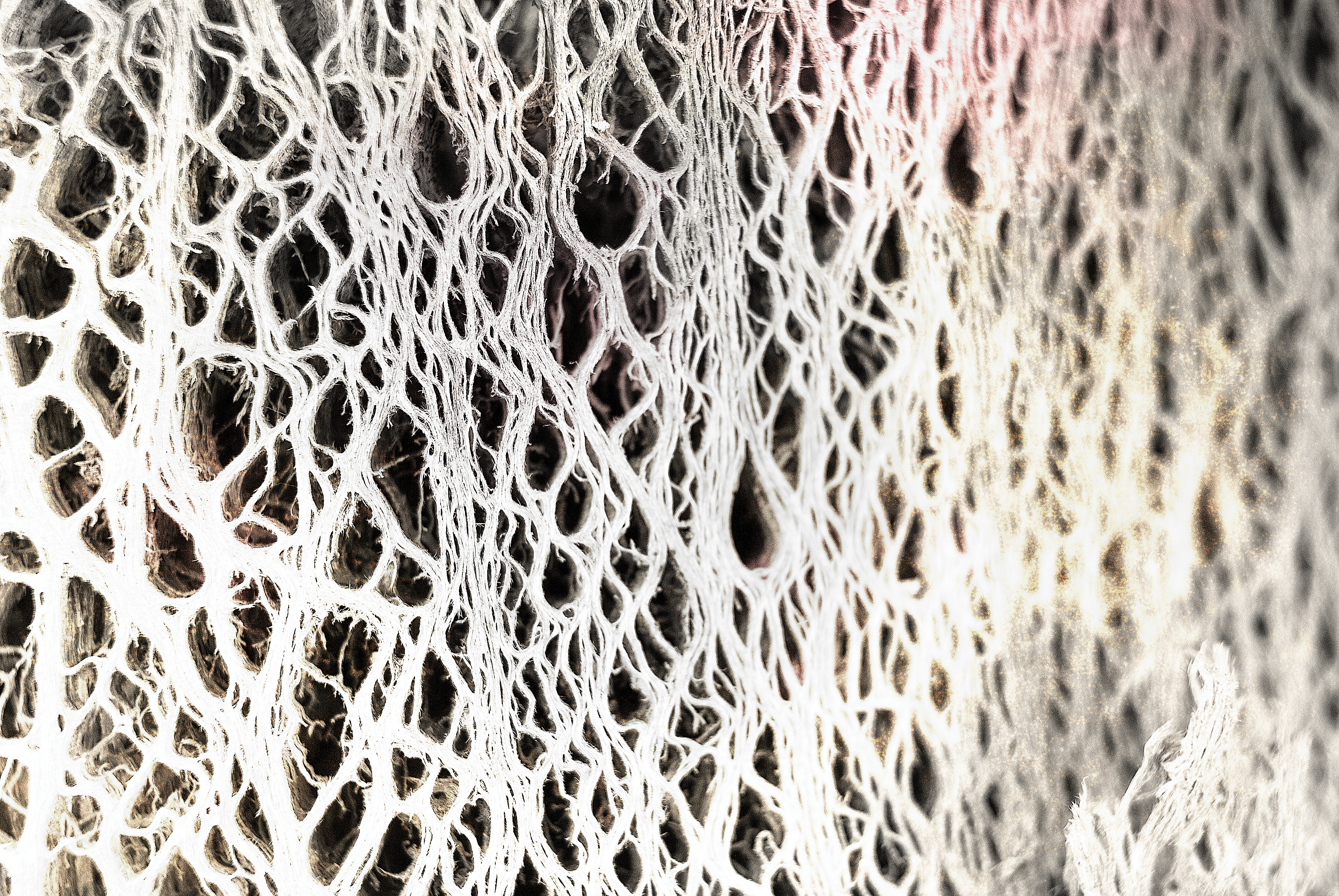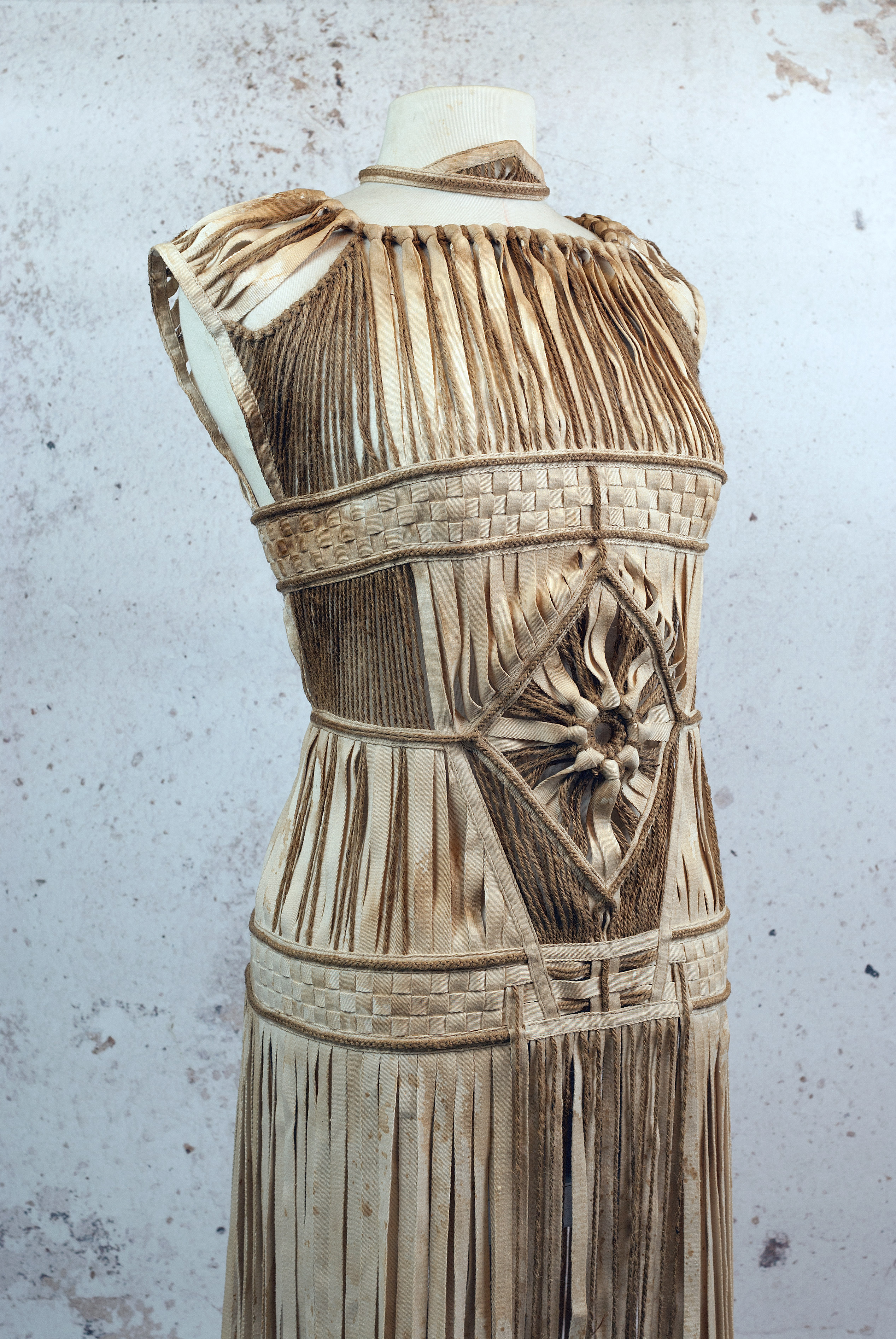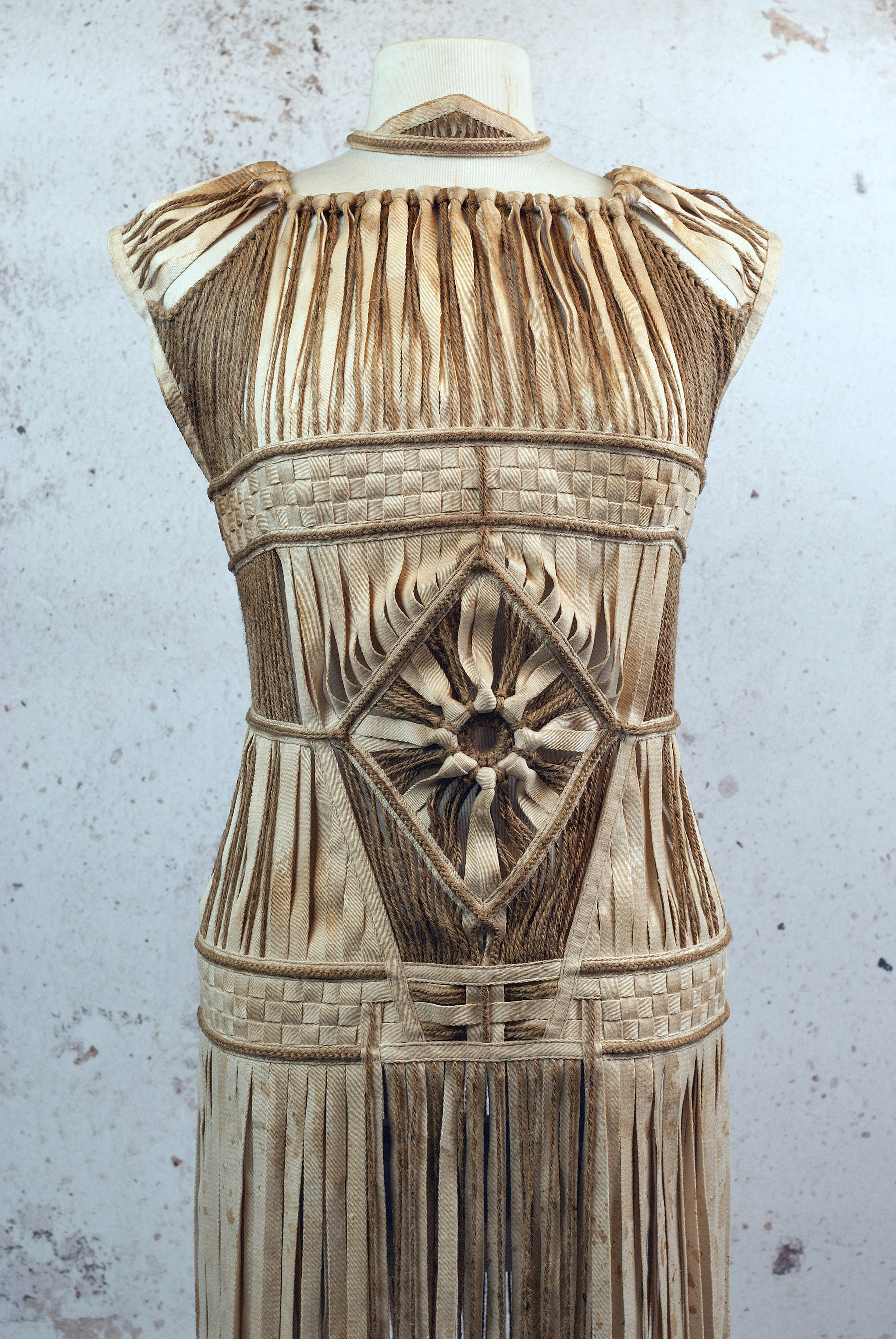 Artwear : lacet de coton, ficelle de chanvre, fil de coton, teinture au thé noir. Couture à la main.