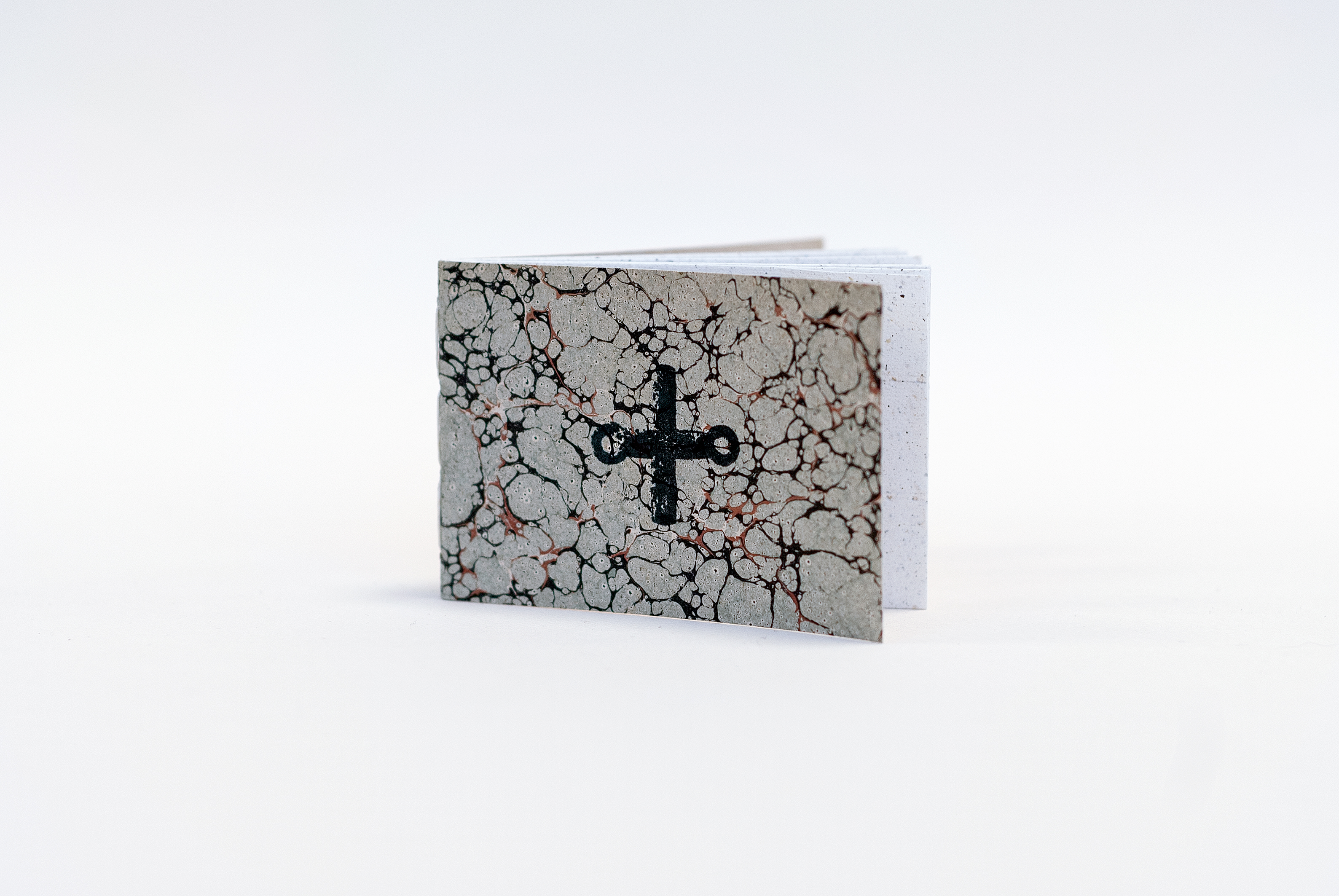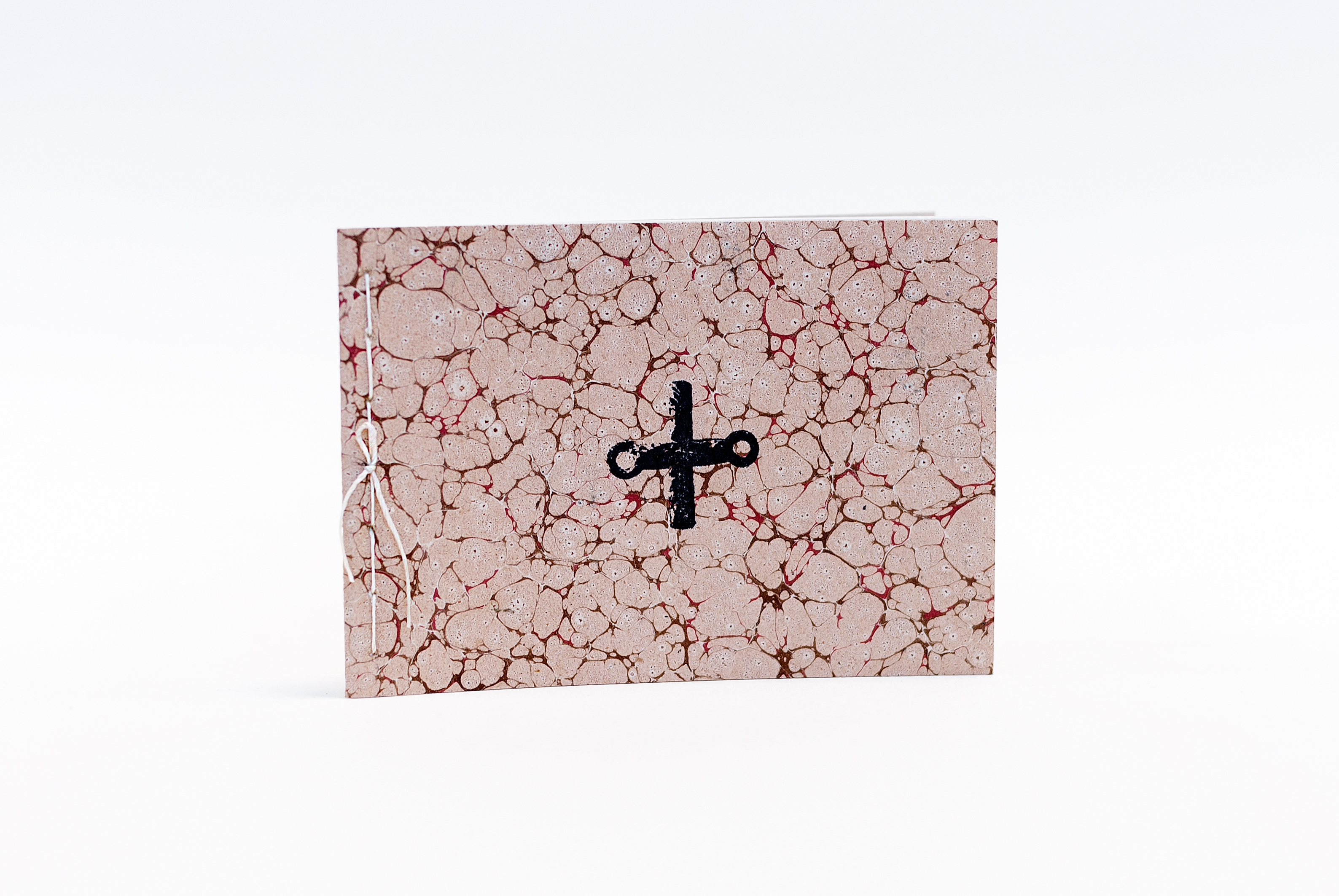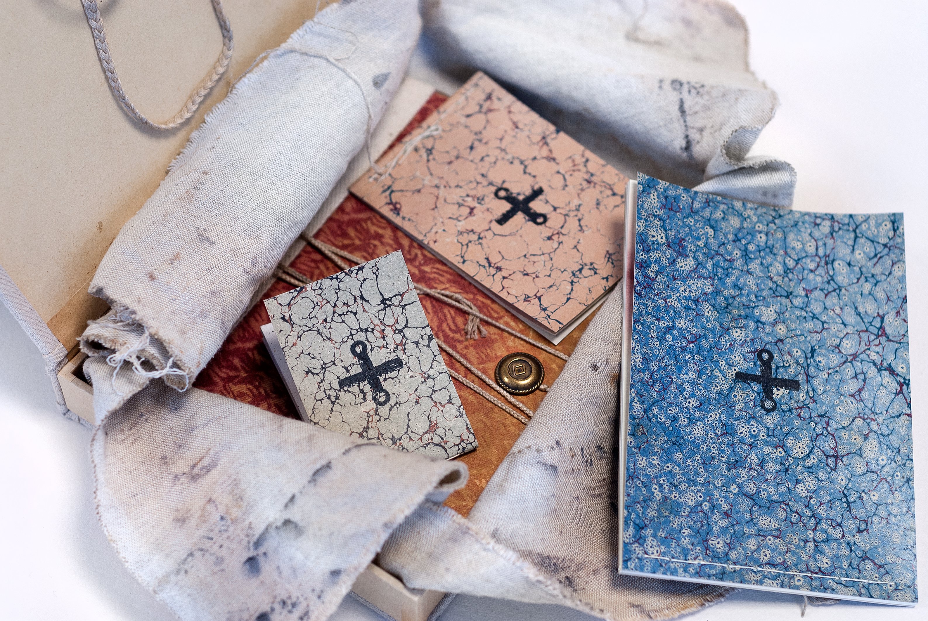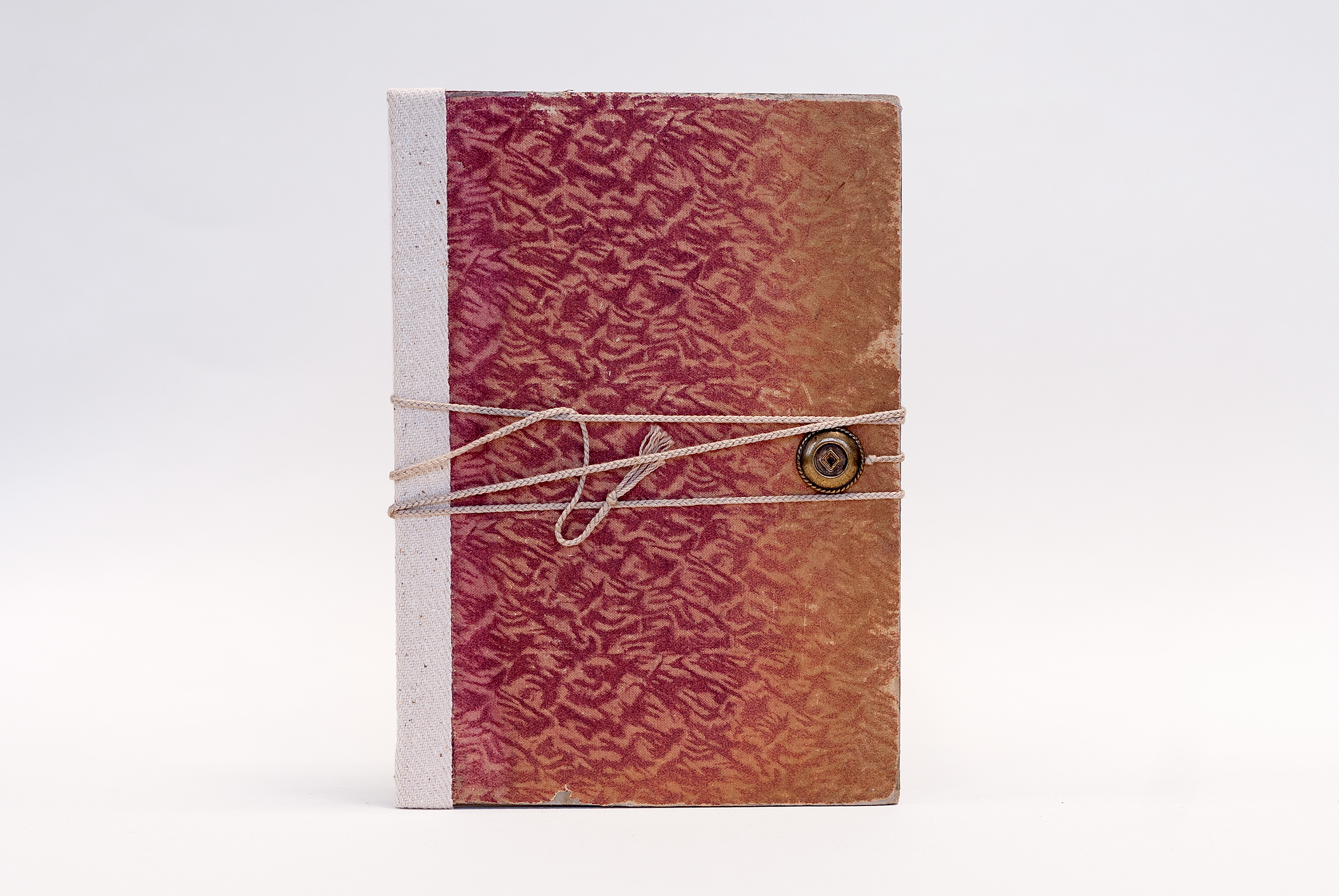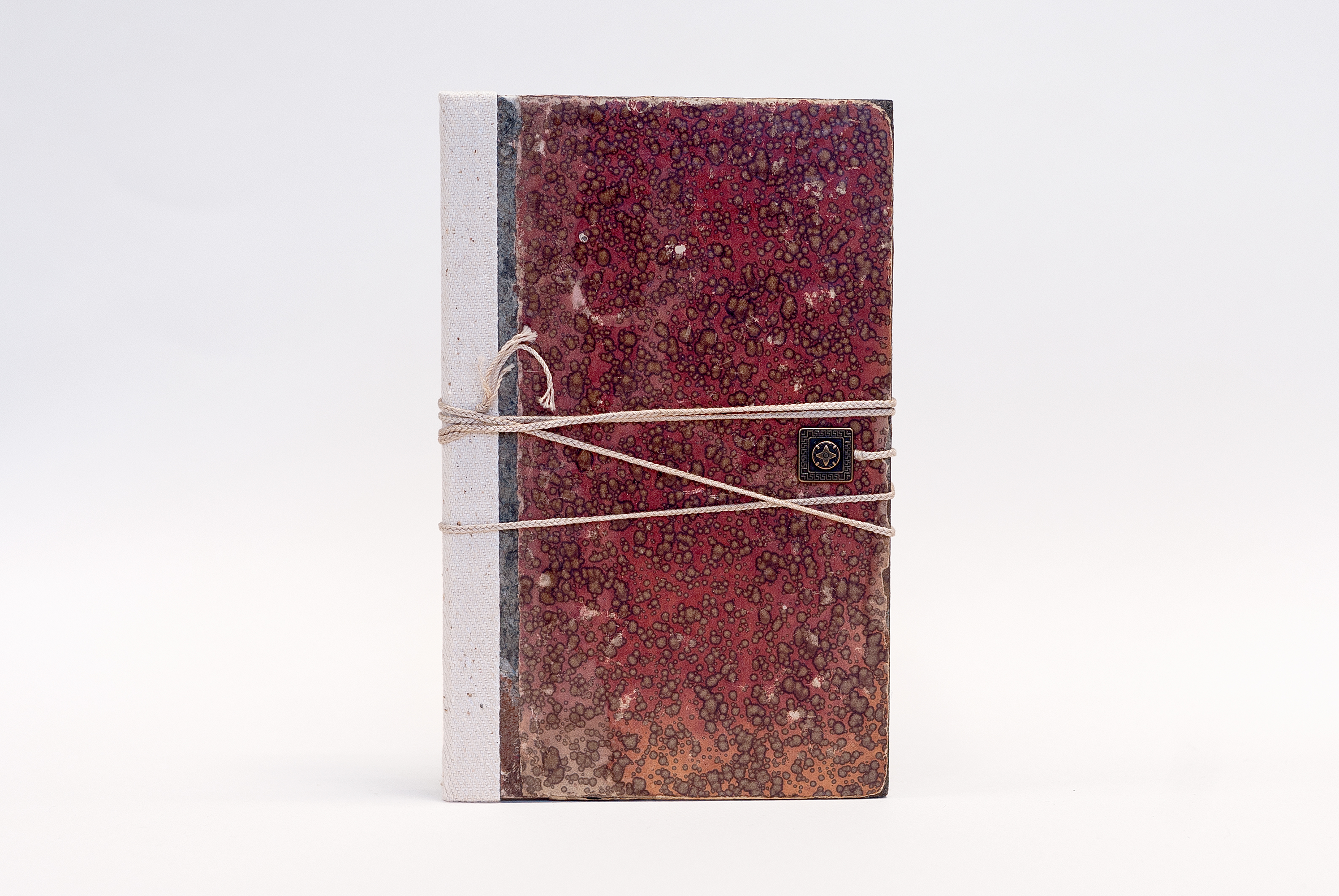 Carnet d’offrande : papier artisanal macéré avec baies de genièvre, terreau, os et lichen, tampon sur page de garde de livres anciens, fil de lin, colle.