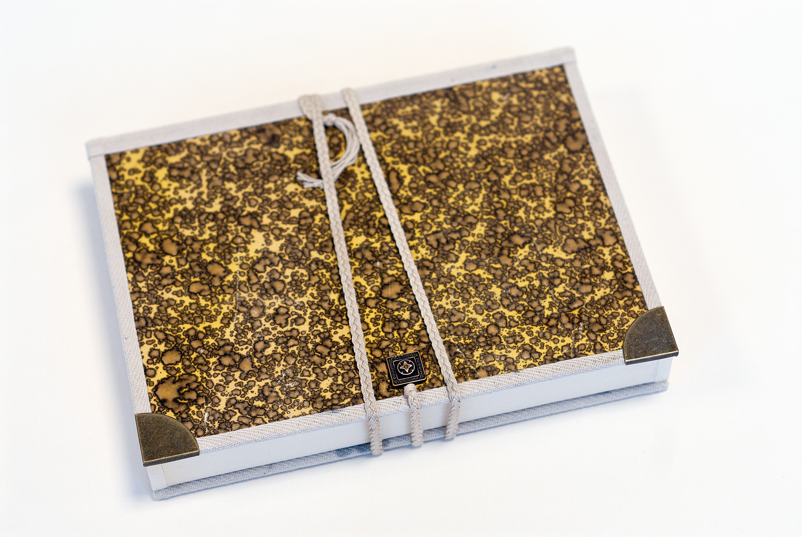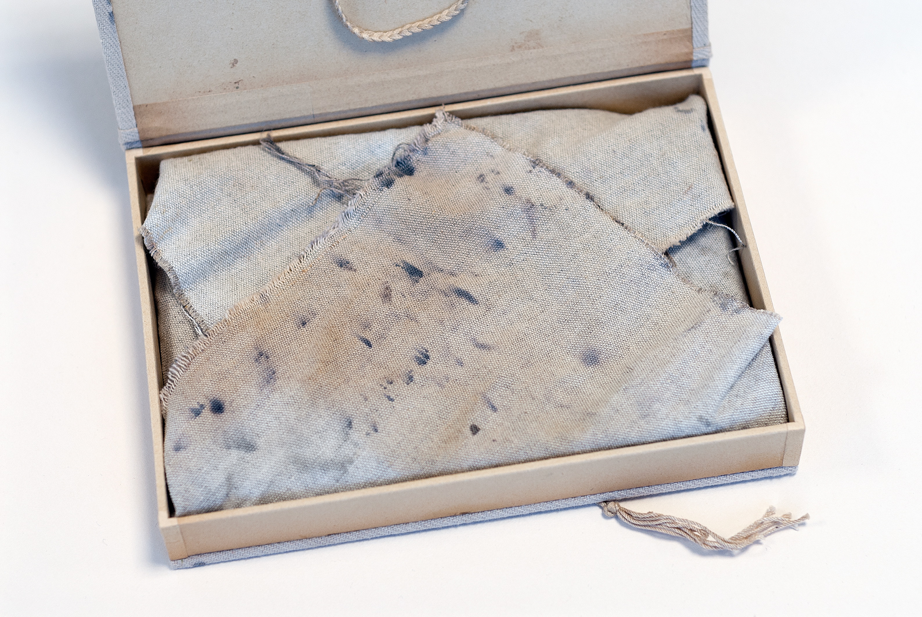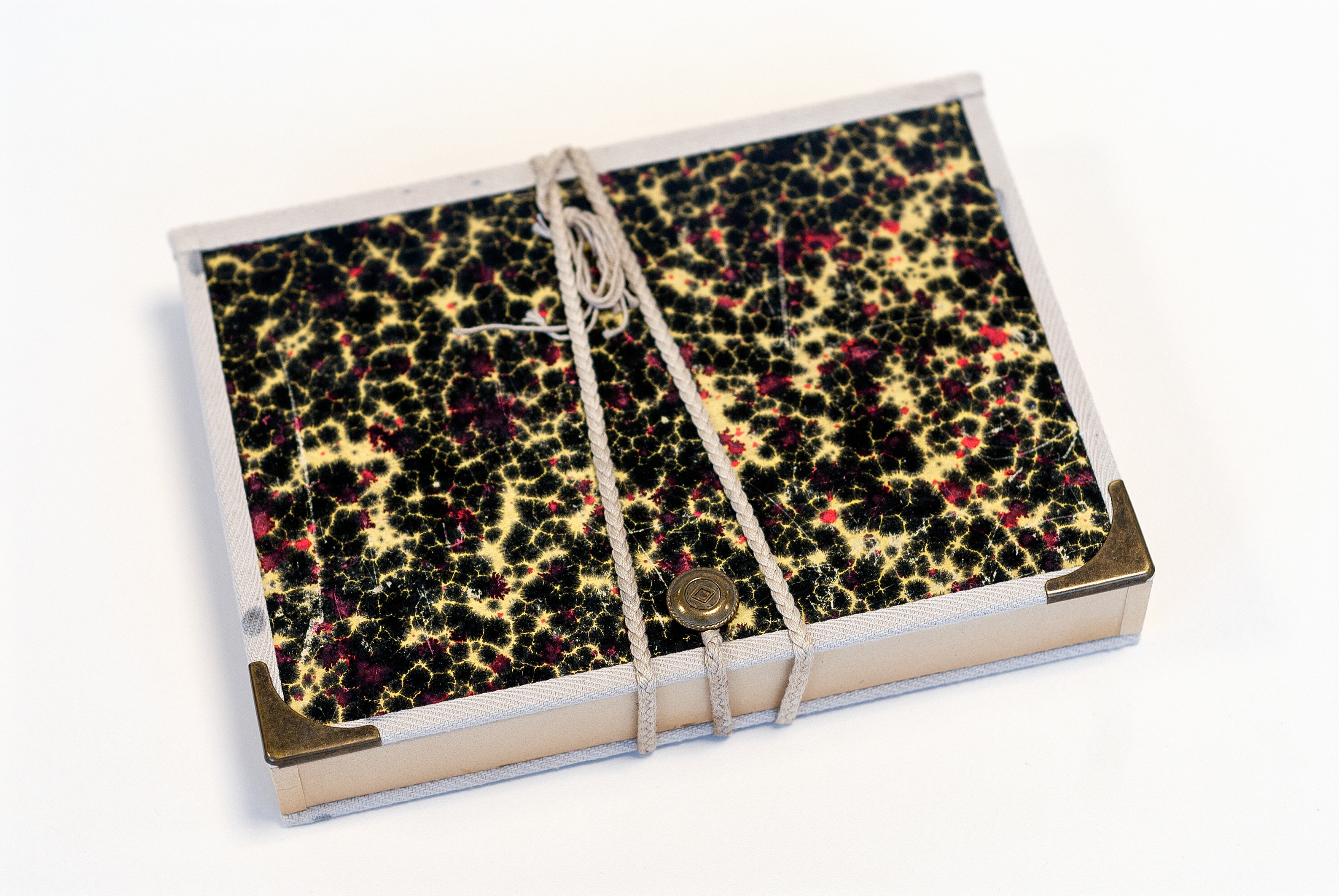Coffret : plats de couverture et pages de garde de livres anciens, toile et ruban de coton teints au thé et tachés de rouille, fil de coton teint au thé, taché de rouille et tressé, fil de lin, ornements en métal au fini vieux bronze, colle.