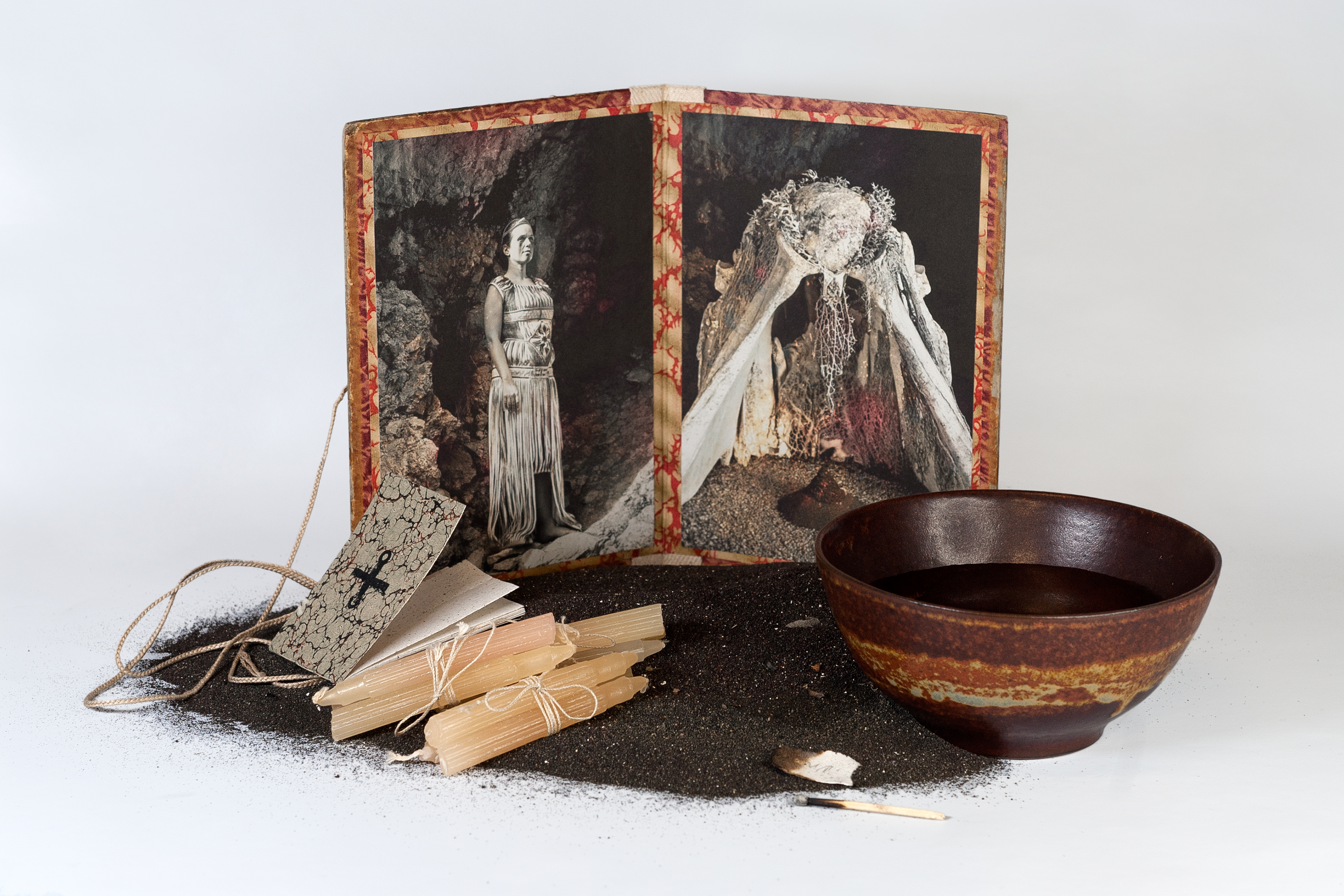 Rituel : autel, sable volcanique noir, carnet de papier d’offrande, 9 bougies en 3 fagots liés de fil de lin tressé, bol, eau, allumette.